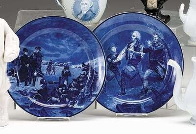 Two blue transferware chargers cauldon