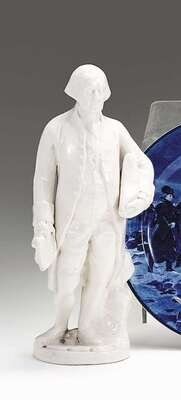 Wearing a long coat, britches and waistcoat, holding a tricorner hat in his left hand and a document in the right.