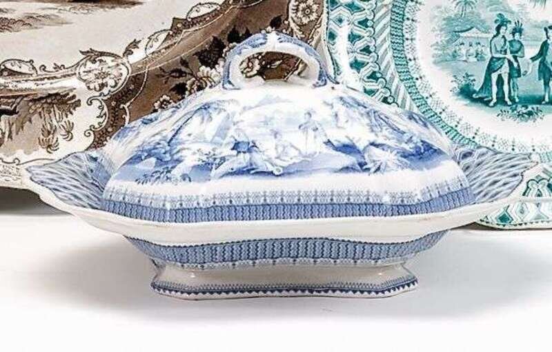 The lobed and domed cover with molded knop on shaped oblong dish decorated with "William Penn's Treaty."