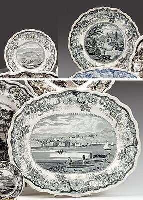 Including a platter and two plates, each decorated with "Picturesque Views," ,The platter with " Hudson, Hudson River ," Baker's Falls Hudson River," and "West Point Hudson River."