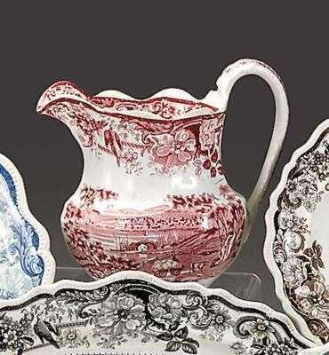 Historical pink transferware jug james and ralph clews, cobridge, 1829-1836