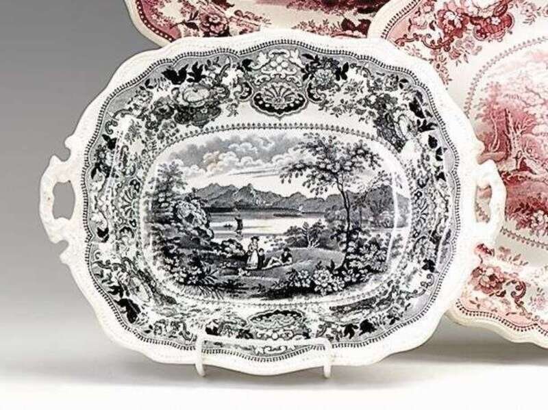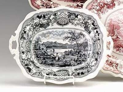 Shaped, oblong form with molded handles, decorated with "Lake George" from the "U.S. Views" series.