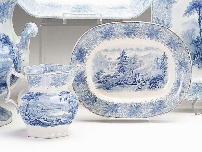 From the "Catskill Moss" series the small oval platter decorated with "Little Falls, New York," the paneled baluster jug decorated with " Wilkes-Barre Vale of Wyoming."
