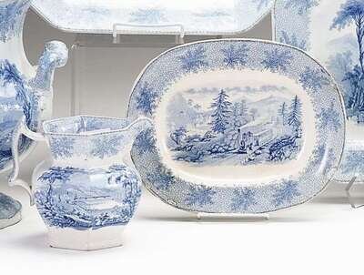 Historical medium blue transferware platter and jug w. ridgway & son, co., 1844