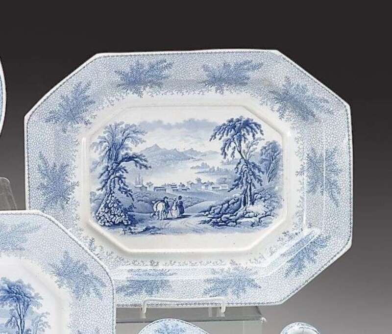 Historical medium blue transferware tureen stand william ridgway, son & co., circa 1844