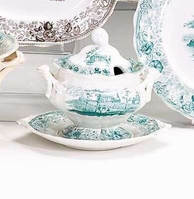 Historical green transferware covered sauce tureen and stand thomas godwin, burslem, 1834-1854