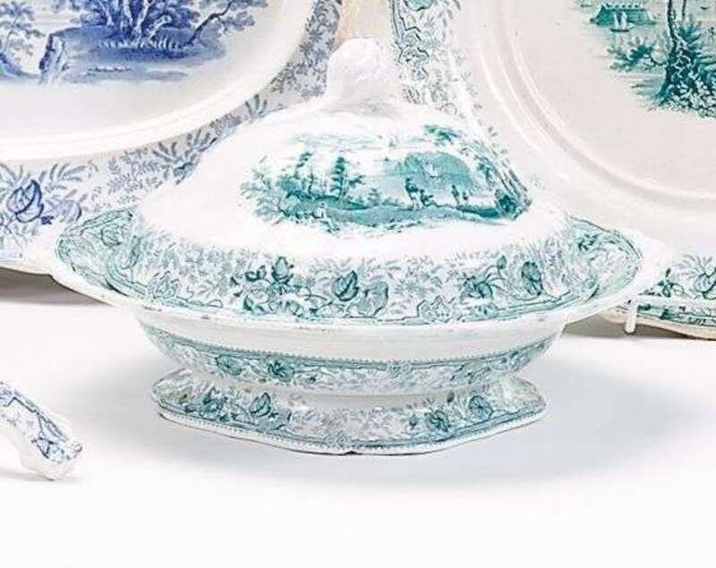 Historical green transferware covered vegetable dish thomas godwin, burslem, 1834-1854