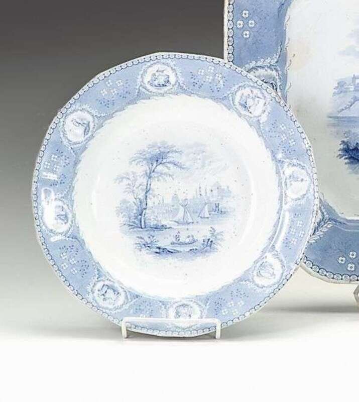 Historical light blue transferware soup plate mellor, venables & co., burslem, circa 1843