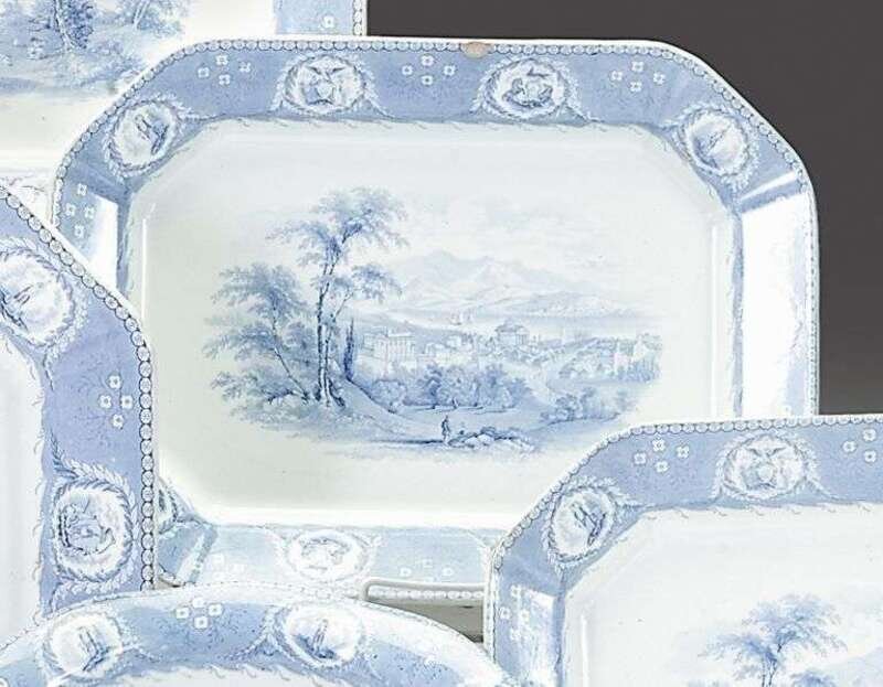 Historical light blue transferware platter mellor, venables & co, burslem, circa 1840