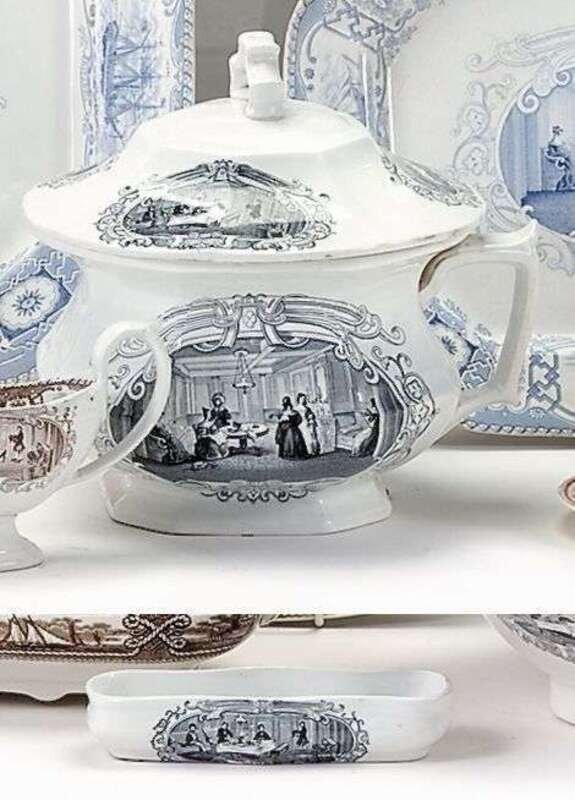 The chamber pot cover and toothbrush caddy decorated with "Gentlemen's Cabin" (Larsen No. 453), the chamber pot decorated with "Ladies' Cabin" (Larsen No. 456), from the "Boston Mails" series .