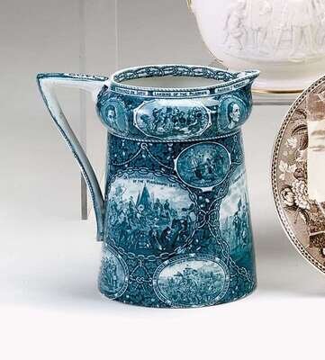 Green-blue transferware commemorative pitcher the rowland marsellus & co., staffordshire