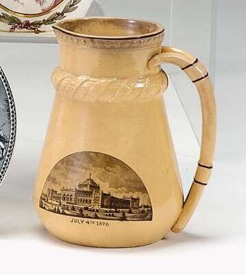 Of tapering form molded with star band at rim and rope-molded and neck and impressed with names of original thirteen states, the handle molded with "1776" and "1876," the body printed with demi-lune shaped reserve showing Independence Hall with inscription "July 4th 1776," and obverse Memorial Hall from the Centennial inscribed "July 4th 1876."