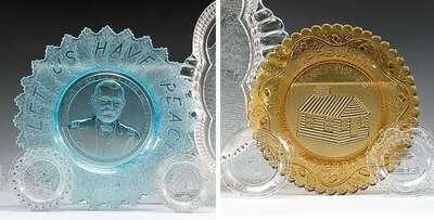 The first of amber color with scalloped edge molded with "Tippecanoe Fort Meigs Wm. Harrison" and log cabin within an oak leaf border; the second of pale blue color molded with "Let Us Have Peace," enclosing portrait of Ulysses S. Grant and inscription "Born April 22, 1822 Died July 2, 1885."