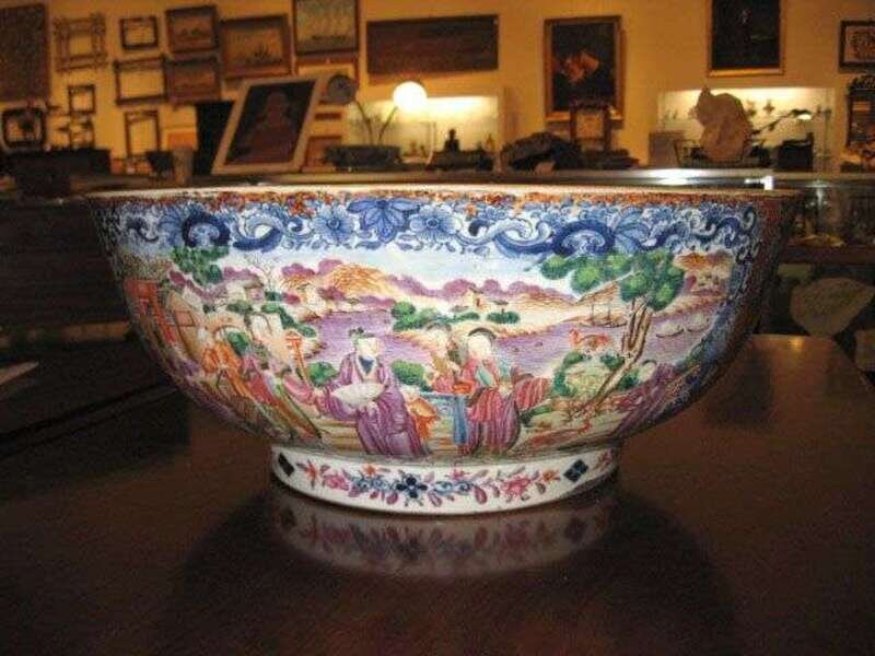 The exterior with two primary Famille Rose reserves enclosing figures and two secondary figural reserves against an underglaze blue scrolling, floral and iron red and gilt cell ground, the interior with a triple border of underglaze blue cells, gilt scrolls with birds reserved against iron red and spear points, the well with another Famille Rose figural reserve.