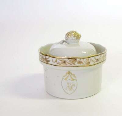Of cylindrical form with everted, vertical scalloped edge, domical lid with berry knop, sepia and gilt flower and berry band, and gilt monogrammed shield.