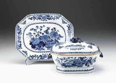 Chinese export porcelain blue and white soup tureen, cover and stand circa 1765