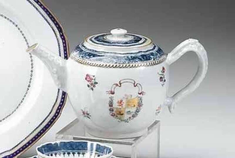 Underglaze Fitzhugh border heightened with gilt and Famille Rose, the arms in color.