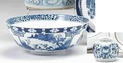 The punch bowl decorated with figural and riverscape reserves within floral borders, the interior with central figure upon a mountain top beside a tree; the jar of squat ovoid form with flaring lip, decorated with floral and graphic devices.