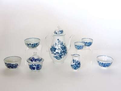Including a pear-shaped coffeepot with floral finial to lid, pear-shaped creamer, covered sugar with floral finial, a saucer, and five teabowls of various size (9).
