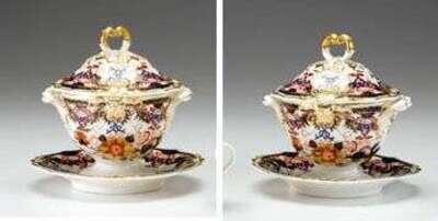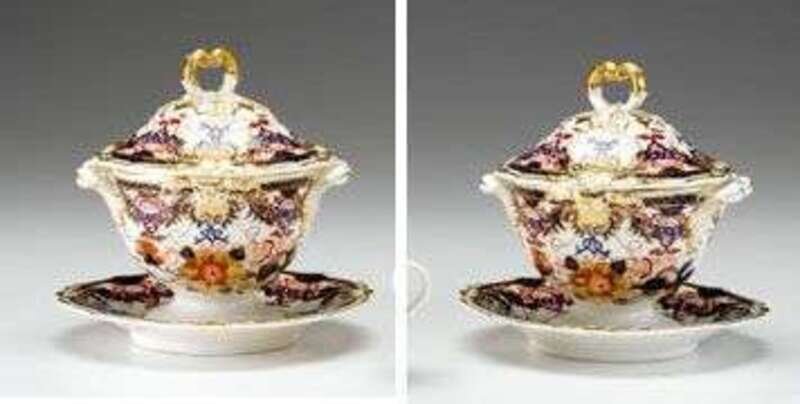 Pair of Bloor Derby Imari palate sauce tureens, covers and stands England, circa 1830