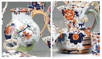 The first, of bulbous form, decorated with "Vase and Jardiniere" pattern; the second, of paneled octagonal form with shaped rim and dragon-form handle.