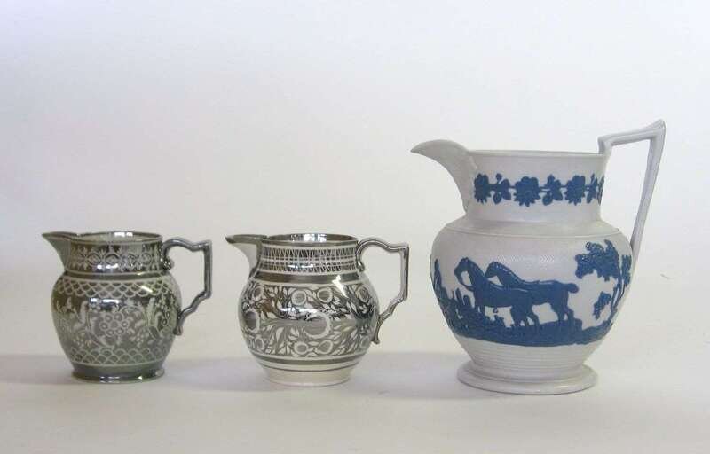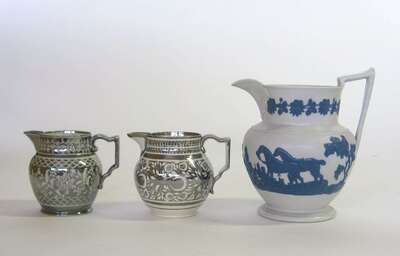 Including two spherical pitchers decorated with silver lustre in floral vine patterns; the third, a jasperware baluster-form pitcher decorated with blue hunting scene, and floral banding on a light gray ground.