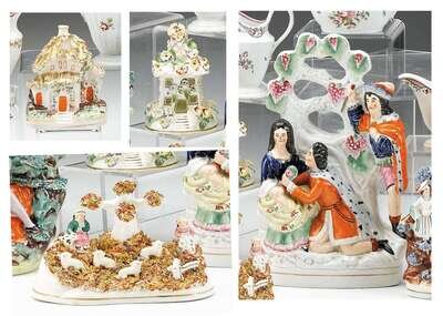Figural group "Rivals," two house form burners and another small figural group with boscage (4).