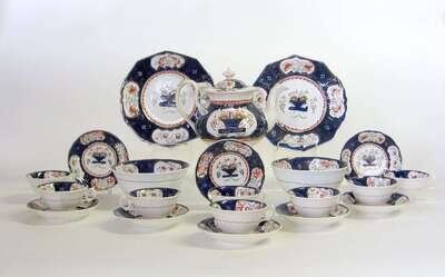 Including a teapot with molded 'C' scroll handle and flaring foot, eight teacups and saucers, two footed bowls and two plates (21).