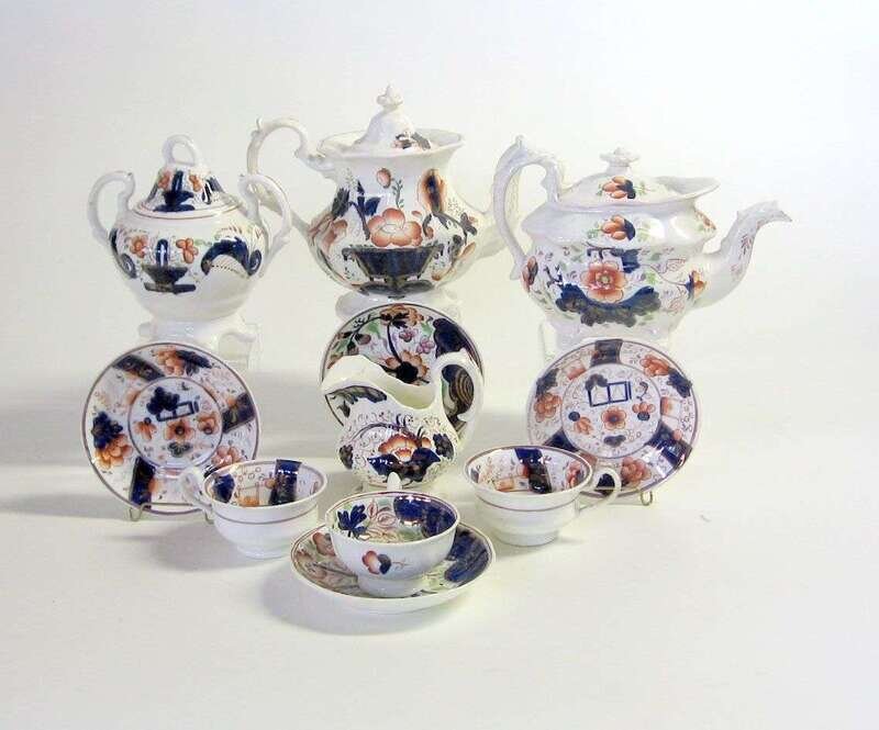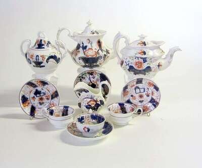 Comprising two teapots, a creamer, covered sugar, three teacups, and four saucers, variously decorated with "Flower Basket" and other patterns (11).