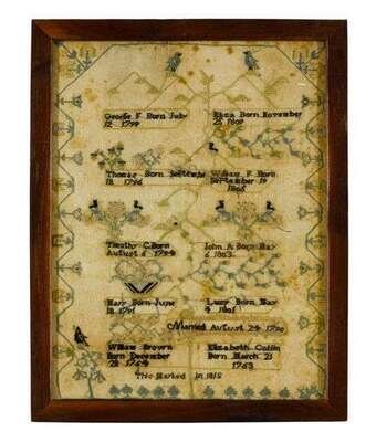 The birth dates of William Brown and Elizabeth Coffin and their eight children worked in silk threads on a gauze ground, framed. Illustrated pg. 31.