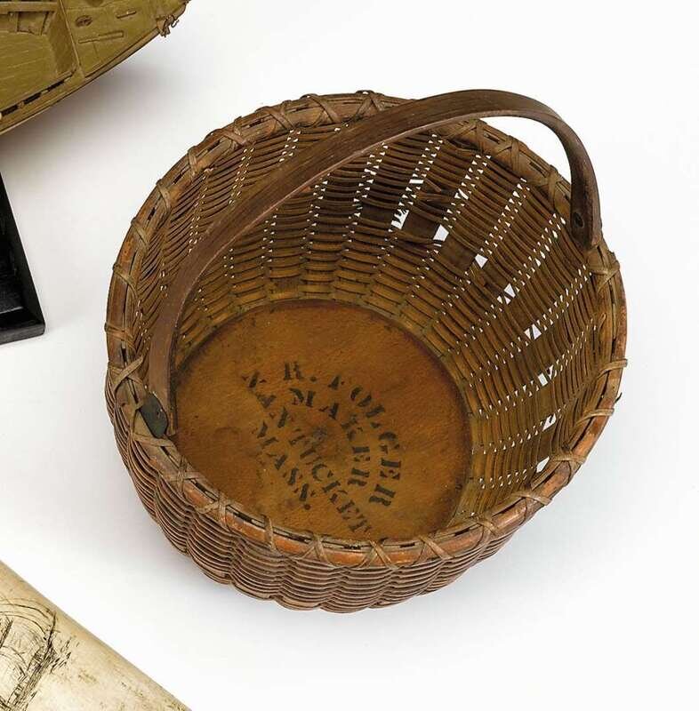 Swing handle nantucket basket stenciled "r. folger maker nantucket mass"