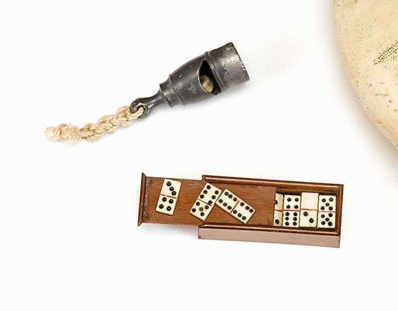 Miniature sliding lid box with ivory dominoes and a Pewter whistle 19th century