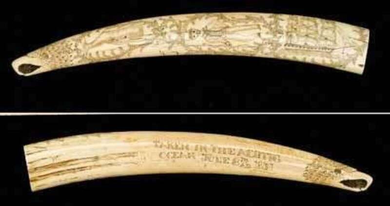 Carved and scrimshaw-decorated walrus tusk dated "june 8th a.d. 1851"