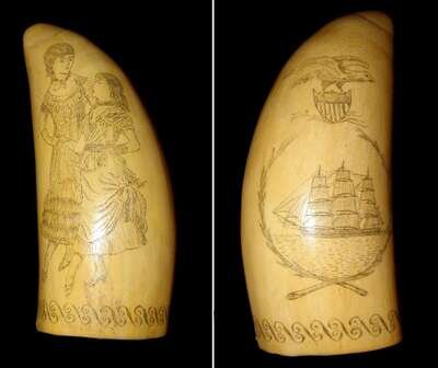 Decorated with American eagle with shield above a wreath enclosing three masted ship on one side and lady and little girl on the other (restoration).