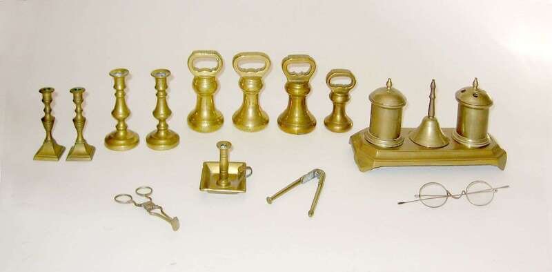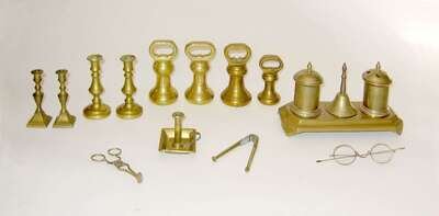 Including two pairs of miniature candlesticks, a miniature chamber stick, four bell weights, a standish, nutcracker , scissor form candle snuffer and pair of brass-framed glasses.