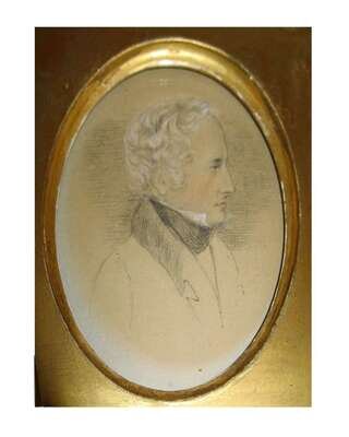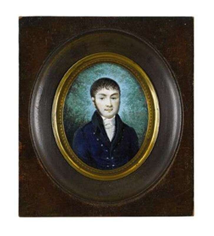 The first a miniature portrait of a young man, signed "A.C. Nogent S/M" oil on ivory, framed: the second, a profile of a gentleman, identified on backboard as "Francis Ellis. .12 Royal Crescent..Bath." pastel on paper, framed. See Illustration pg. 51.