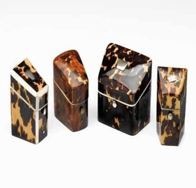 Each of trapezoidal form with slant lids, one with mother-of -pearl edges, two retain paper needle cases, one marked "Lund Cornhill." See Illustration pg. 57.