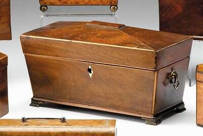 With pearwood inlay, ivory escutcheon, brass handles at sides, brass feet. See Illustration pg. 60.