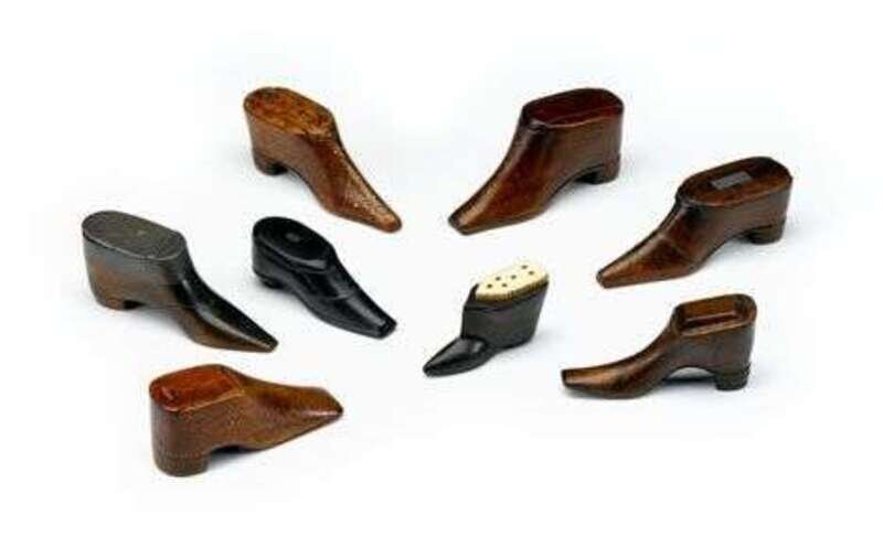 All in the form of shoes, one with pewter hinged lid inscribed "W.Walker Dundonald," others studded with steel, one having an ivory sliding lid.