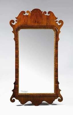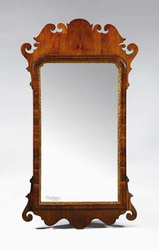 The shaped crest flanked by scrolled ears above a rectangular plate with a carved frame over a shaped base flanked by similar ears.