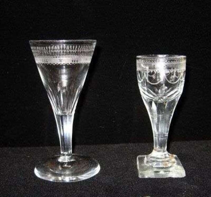 The first with octagonal stem, square base, swag and saw tooth borders , the second, tapering to octagonal stem and circular base.