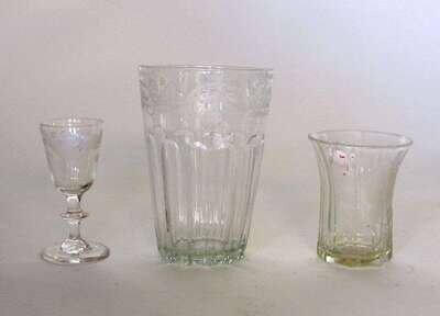 Including a molded flip glass with geometric and scrolled etching, a knop-stem cordial with leafy band decoration, and a tapering paneled tumbler etched with roses.