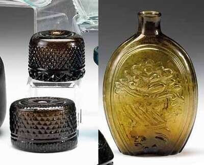 Blown amber glass flask and two amber inkwells new hampshire, 19th century