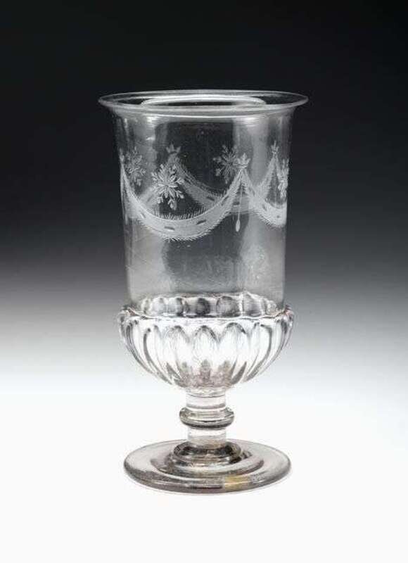 Flaring rim on urn form etched with swags and flowerheads, fluted base on ringed stem and circular foot.
