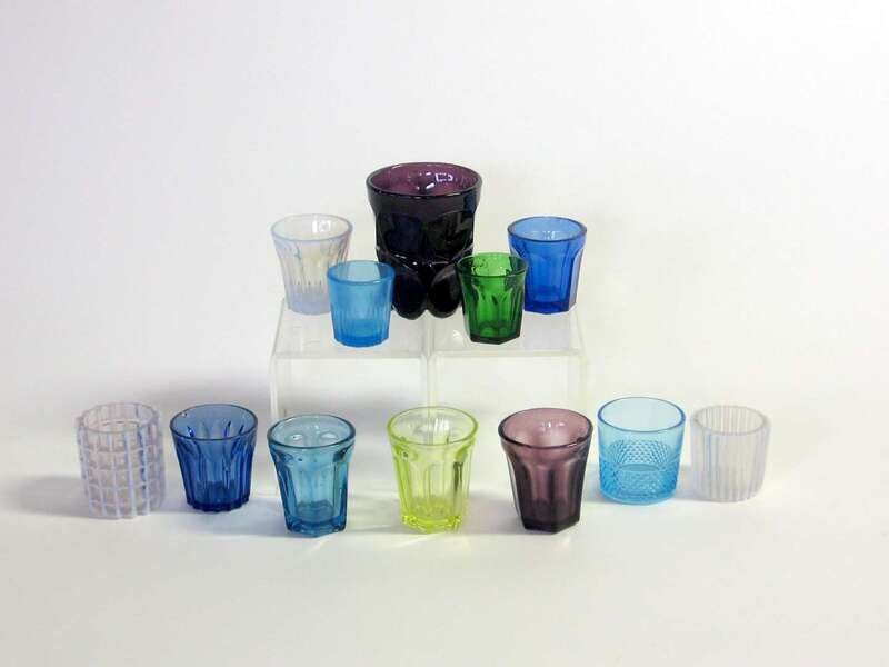 Including a purple glass faceted tumbler, two opalescent and uncolored molded toothpick holders, a press light blue toothpick holder, and eight shot glasses, six thumb molded in blue, pale green, purple, and dark green, two fluted in blue and clam broth, the last molded in blue.