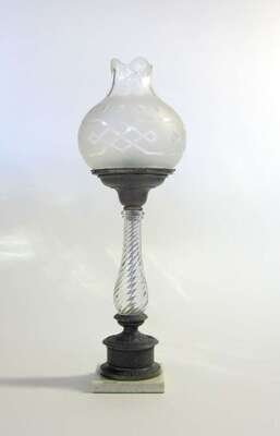 Frosted and etched shade on brass font and uncolored spiral-blown glass stem on classical columnar support.
