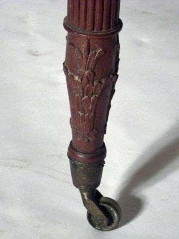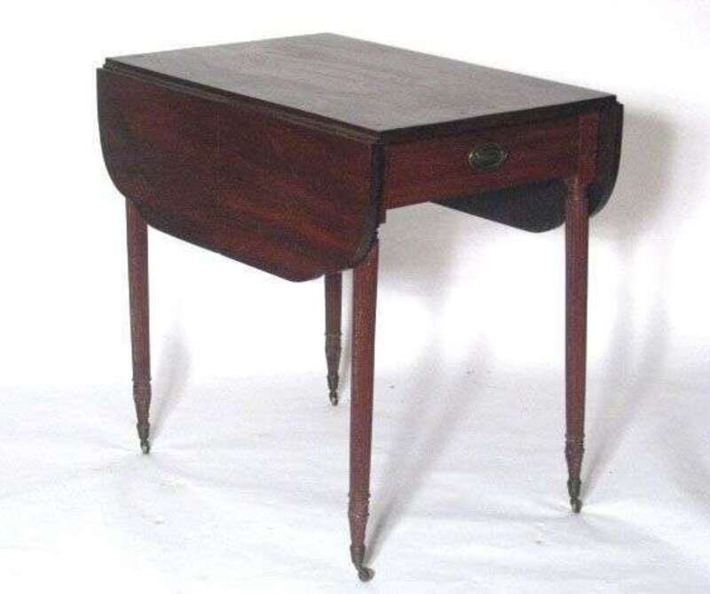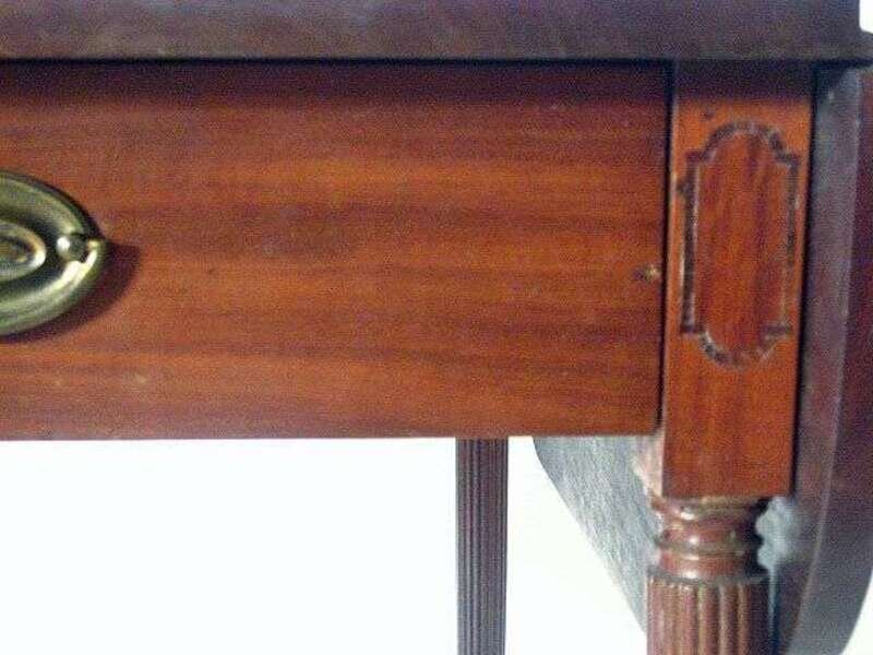 The rectangular top with shallow "D" shaped leaves, on apron with single drawer, on round reeded legs and turned floral-carved feet with metal caps and casters.