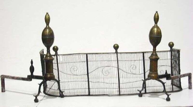 Faceted support on spurred base on spurred cabriole legs adn ball feet; together with a serpentine brass and wirework fender.