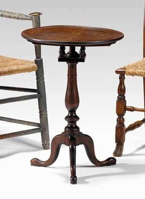 Dished top on bird cage and baluster-turned support and arched cabriole legs ending in snake feet.