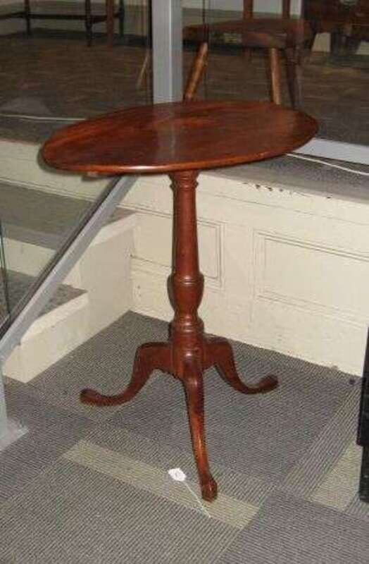 Oval top on baluster shaped support on arched legs ending in snake feet.